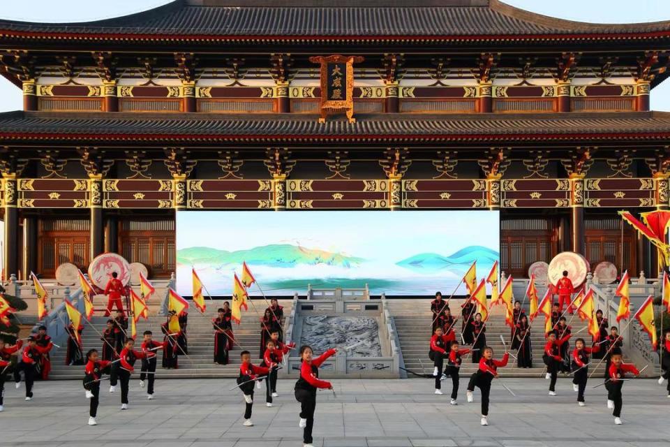 大成殿广场上,旌旗环绕,队列整齐,擂鼓轰鸣。大会在刚劲威猛、气势如虹的《八极震云天》表演节目中拉开帷幕,不同年龄段的八极拳习练者登台展示精湛技艺,一招一式尽显扎实功底,大有“晃膀撞天倒,跺脚震九州”之雄风。现场观众沉浸于独特的武术魅力之中,也近距离领略到八极拳的深厚底蕴。